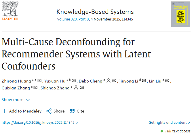 重点实验室博士生黄之荣为第一作者的论文“Multi-Cause Deconfounding for Recommender Systems with Latent Confounders” 已被Knowledge-Based Systems(KBS)在线发表。KBS是Elsevier旗下专注以知识为基础的人工智能系统的期刊,是中国科学院定位为计算机科学学科的SCI一区期刊,该期刊今年的影响因子为7.2。