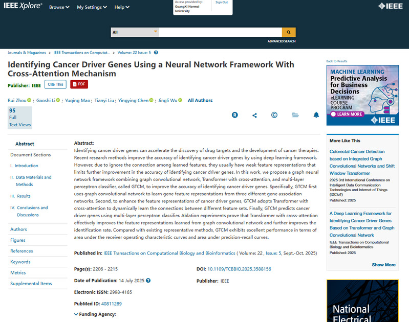 重点实验室硕士研究生周锐为第一作者的论文“Identifying cancer driver genes using a neural network framework with cross-attention mechanism” 已被IEEE Transactions on Computational Biology and Bioinformatics在线发表。IEEE Transactions on Computational Biology and Bioinformatics是计算生物学与生物信息学领域的期刊,是中国科学院定位为计算机科学学科的SCI三区期刊,该期刊今年的影响因子为3.6。