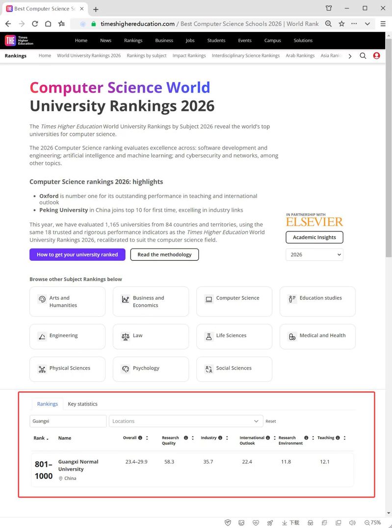 2026年泰晤士高等教育(THE)世界大学学科排名于近日正式发布。广西师范大学计算机科学学科成功入围,位列全球第801-1000名。